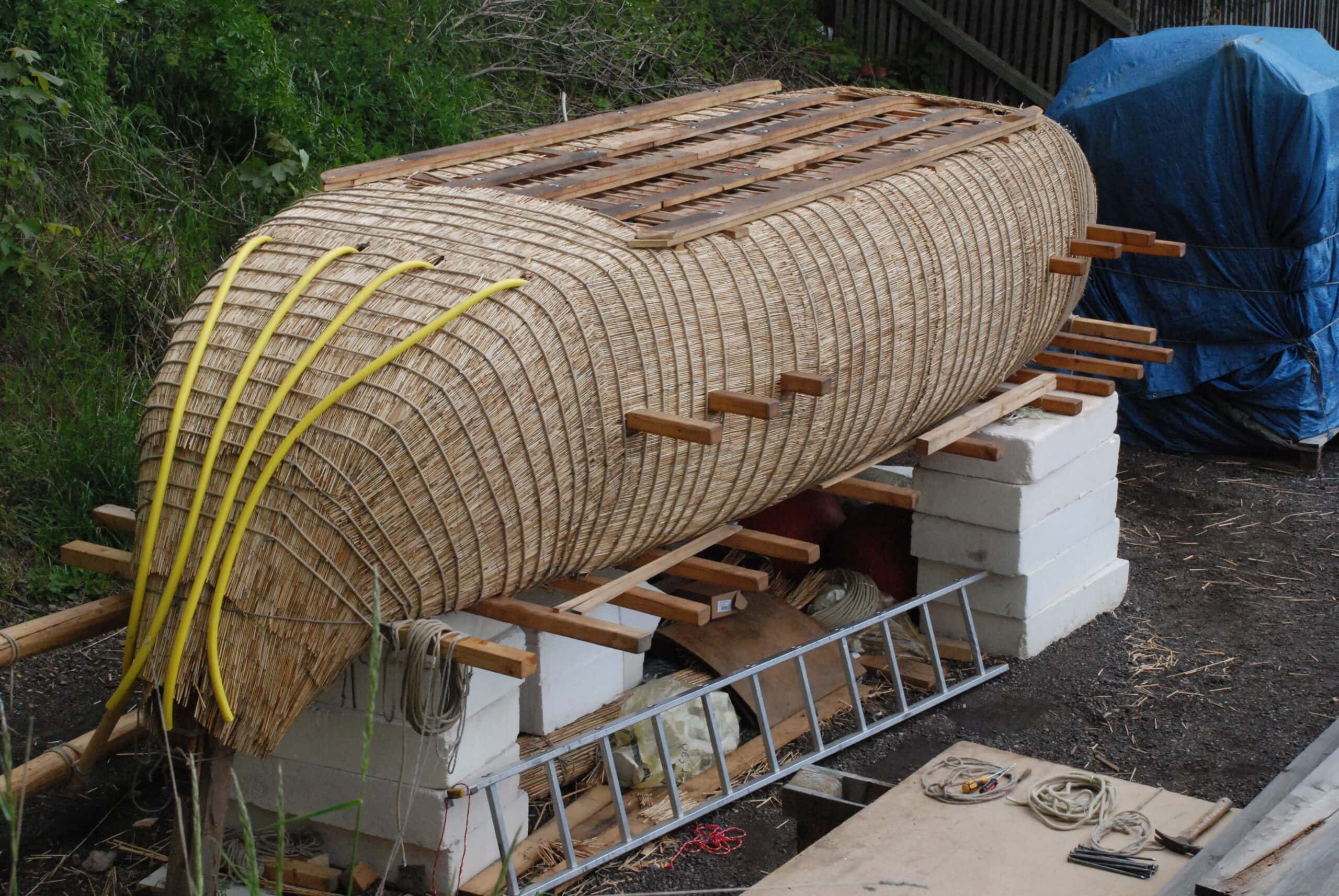 Der Rumpf der DILMUN S besteht aus einem hölzernen Innenskelett, das vier GFK-Rohre als Wasserballast trägt (insgesamt ca. 800 Liter). Die Zwischenräume wurden in aufwendiger Handarbeit mit passgenau zugeschnittenen Styroporblöcken ausgefüllt. Auf dieser Basis formte das Team die typische Schilfboot-Architektur, die anschließend von zahlreichen Helfern mit Schilfrollen und Seilen umwickelt wurde.