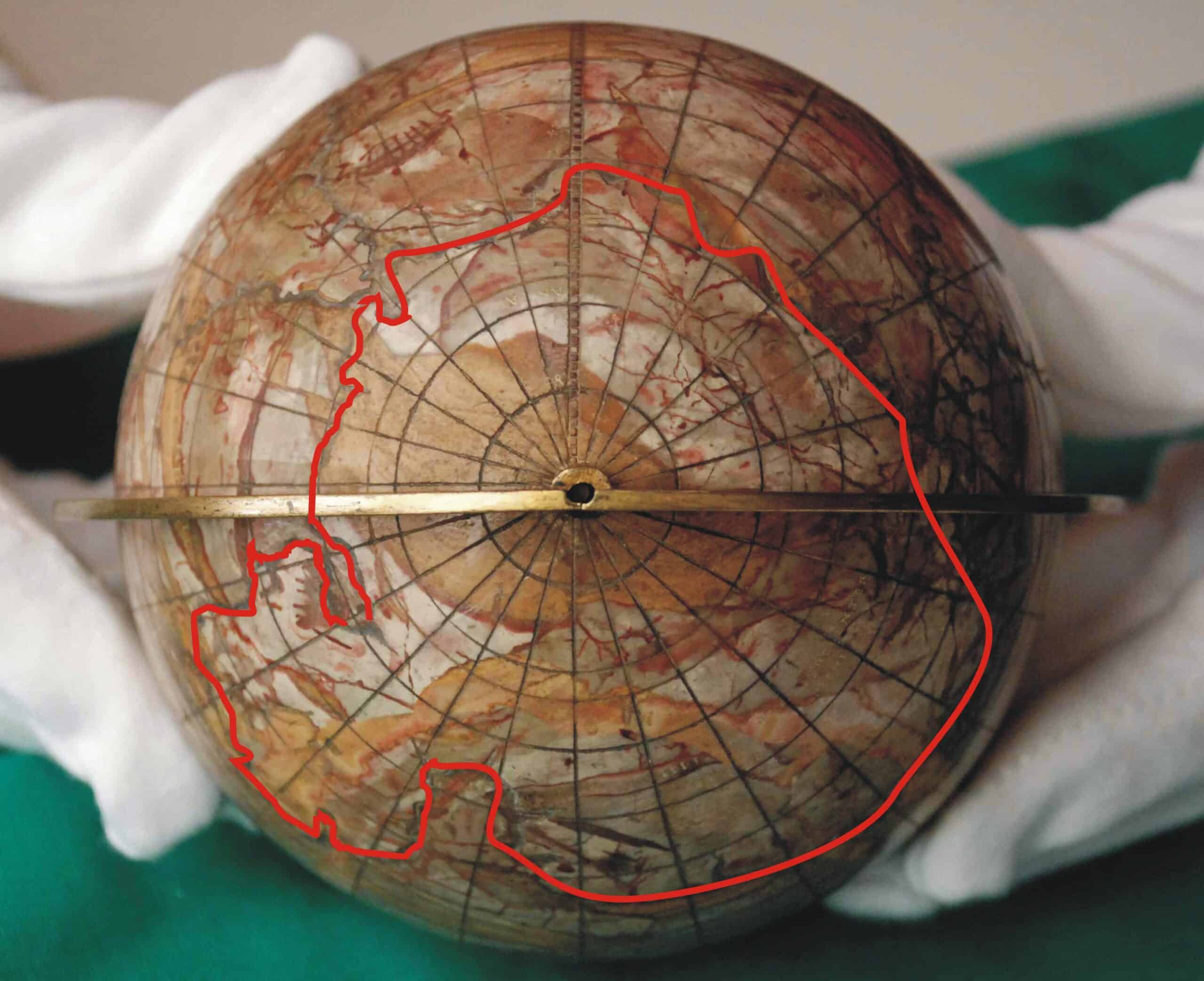 Der Marmorglobus von Gotha (1533) zeigt die exakten Umrisse der Antarktis und S-Amerikas (links).