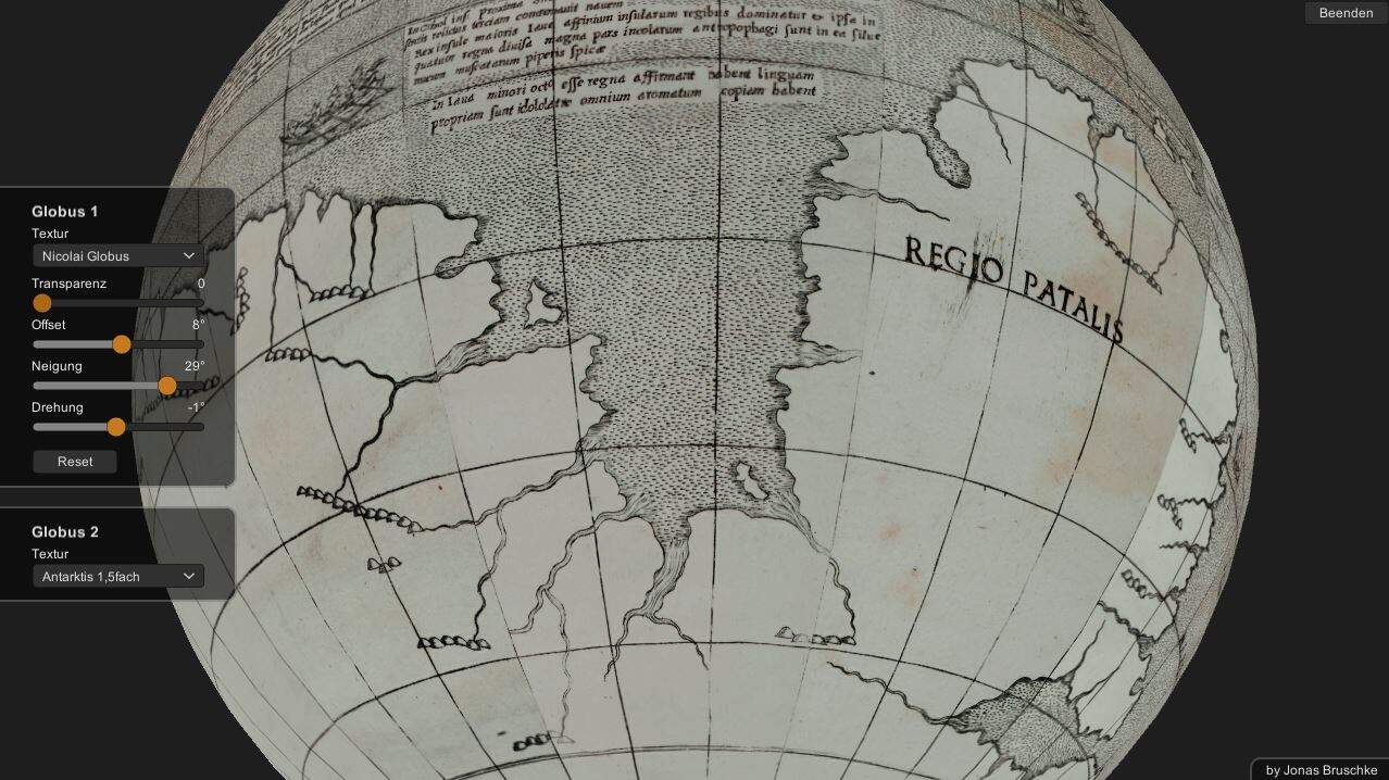 In einem gemeinsamen Projekt mit Dr. Andreas Bruschke und mit Unterstützung von Dr. Jonas Bruschke entstanden zudem virtuelle Rekonstruktionen sämtlicher erhaltener Schöner-Globen in Deutschland, darunter auch der in Stuttgart wiederentdeckte Globus eines Schülers von Johannes Schöner. Ziel dieser Arbeiten war es, historische Küstenlinien erstmals georeferenziert mit modernen Kartendaten zu vergleichen, um Abweichungen und Übereinstimmungen quantitativ zu erfassen.