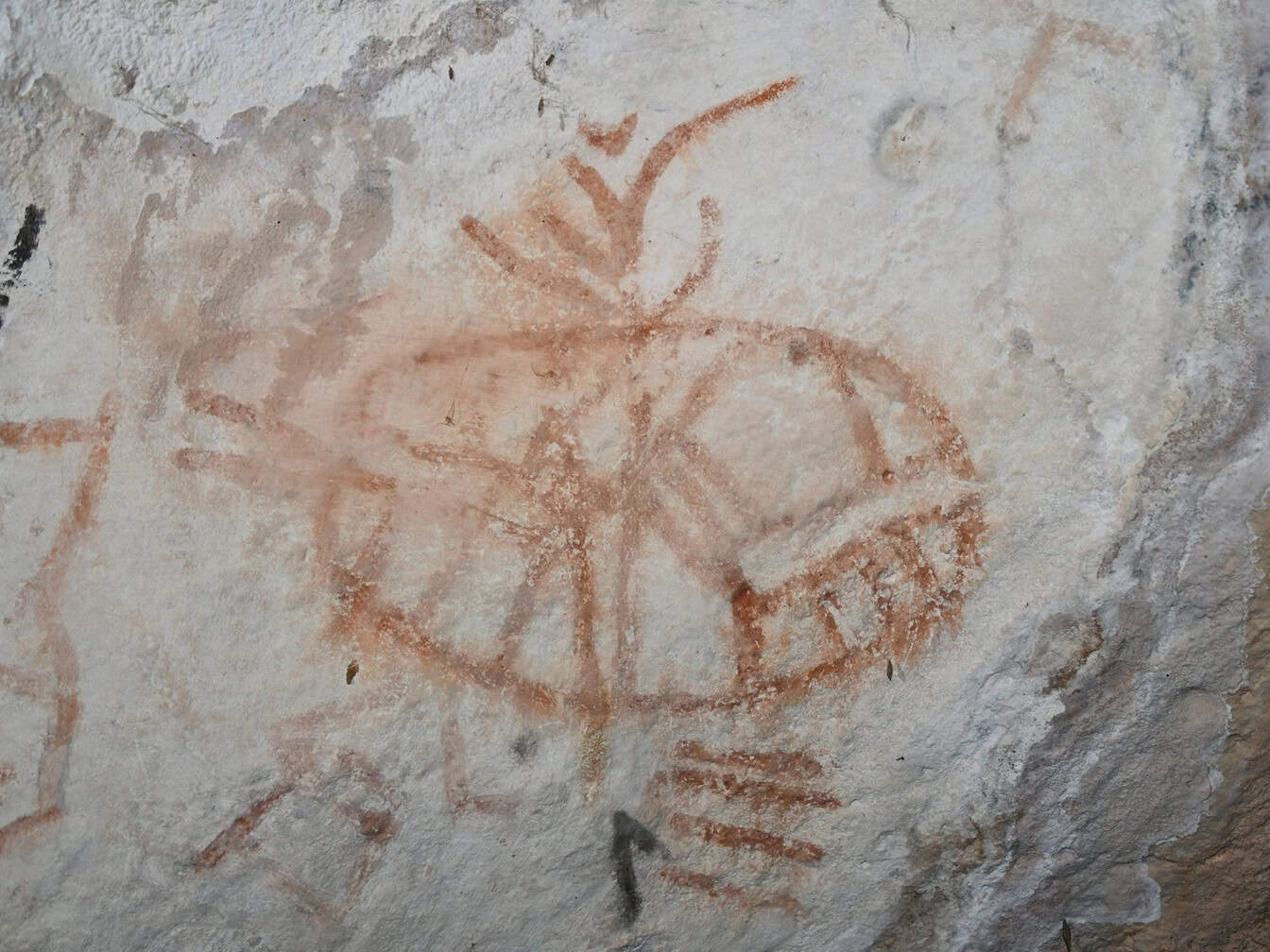 Diese Höhle erweist sich als ein außergewöhnliches Archiv prähistorischer Symbolik. Ihr herausragendster Befund ist die Darstellung eines Schilfbootes in roter Farbe, das in frappierender Weise nahezu alle charakteristischen Merkmale eines prädynastischen Schilfseglers der oberägyptischen Negada-III-Kultur (um 3.100 v. Chr.) aufweist. Zu erkennen sind ein Dreieck-Quersegel, Bug- und Achterkabine, markante Stevenformen – und bemerkenswerterweise sogar mehrere Seitenschwerter am Vorderschiff. Eine solche Detailgenauigkeit ist weder aus der bekannten indigenen Bildsprache der Karibik noch aus rein funktionalen Darstellungen zu erklären.
