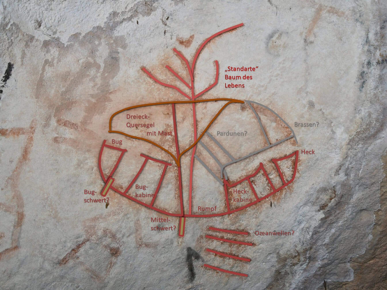 Dominique Görlitz interpretiert diese Darstellungen auf der rechten Seite nach seinen Jahrzehnte langen Erfahrungen. Die Bezeichnungen geben die Teile der Takelage wieder. Besonders auffällig ist das Dreieck-Quersegel, das auch ein wenig an ein noch moderneres Lugger-Segel erinnert. Aber auch die anderen Details ähneln erstaunlich ihren vermeintlichen Vorbildern in der Alten Welt.
