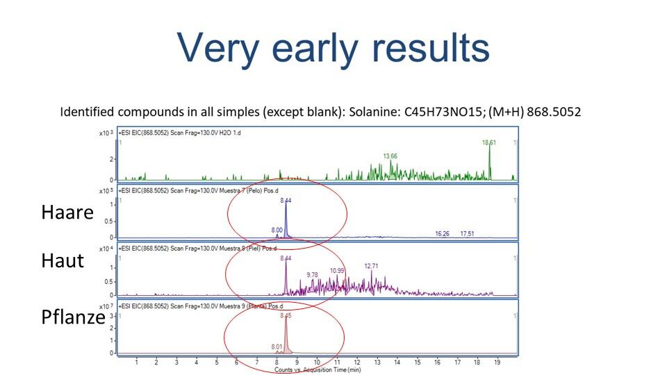 Erste Voruntersuchungen mittels Flüssigchromatographie (LC) an Proben aus Athen und A Coruña ergaben ein unerwartet komplexes Bild. In einer einzelnen Probe – einem Schädel mit blondem Haar – ließen sich über 30 verschiedene Phytoalkaloide nachweisen. Bislang konnten zwei Substanzen eindeutig identifiziert werden: